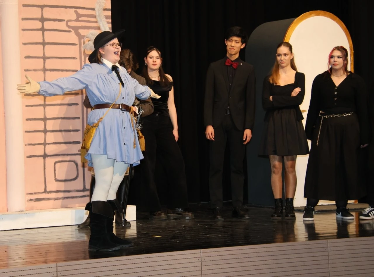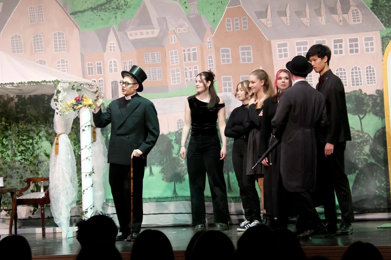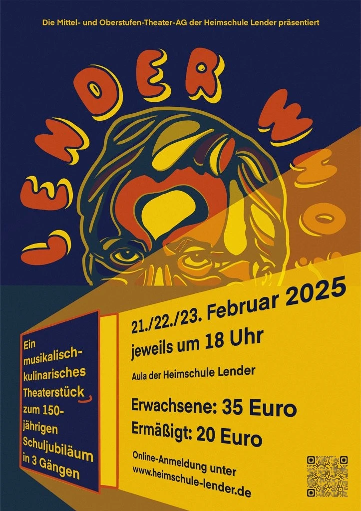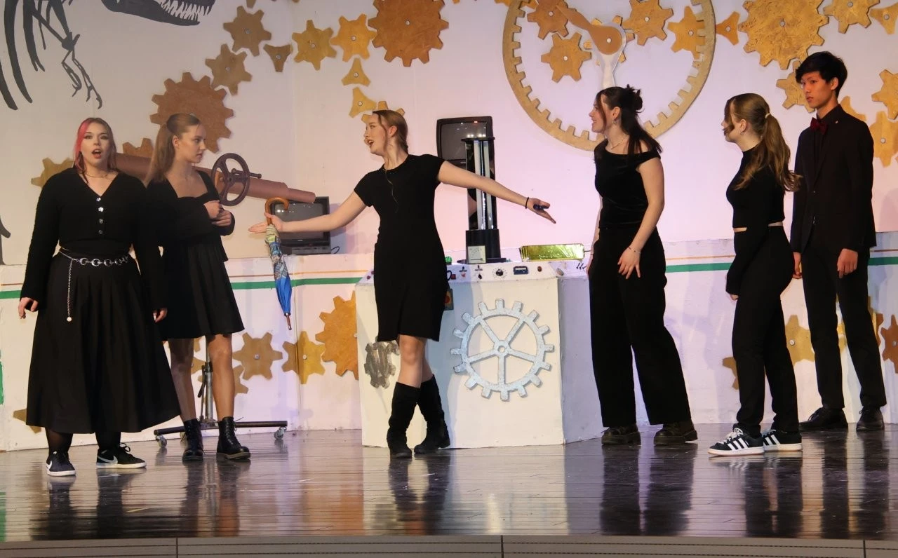 Eine Zeitmaschine beamte Lenderschüler in das Jahr 2120 und sie erleben, wie Schülern nach einem ChatGPT-Aufstand die Holobrillen wieder abgenommen werden, Lehrer im Unterricht zum gedruckten Buch zurückkehren und die KI- Schulleitung nach der Rückkehr aus der Zukunft wieder mit einer echten Person besetzt wurde. Dies alles erlebten die Zeitreisenden bei 3 ausverkauften Aufführungen in der Aula, die ganz im Zeichen des 150. Jubiläums der Schule von Franz Xaver Lender standen, die lange Reihe der glänzenden Theater-Projekte fortsetzte und darüber hinaus als Sahnehäubchen die Gäste mit einem köstlichen Drei-Gänge-Menü von Chefkoch Christoph Furtwängler und dessen Lender-Küchenteam verwöhnte. Das war Kulinarik vom Feinsten, die der Küchenchef aus Töpfen und Pfannen zauberte. Dafür gab es als „Nachspeise“ viele kulinarische Komplimente sowie stehende Ovationen für die Akteure der Theater-AG der Mittel- und Oberstufen rund um die Regisseure Adrian Keller, Thomas Dresel und Laura Fischer.