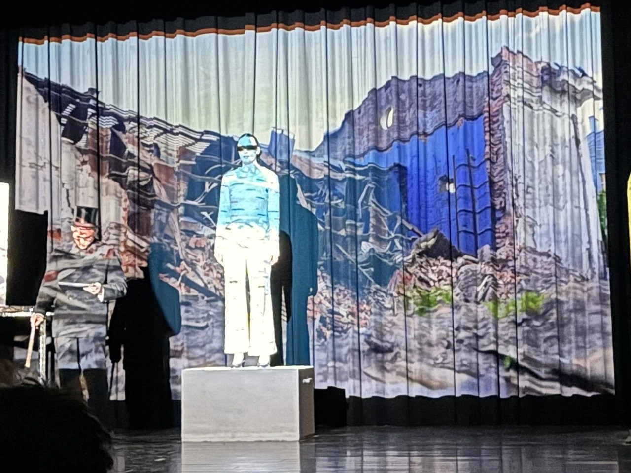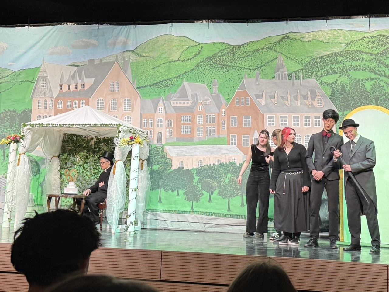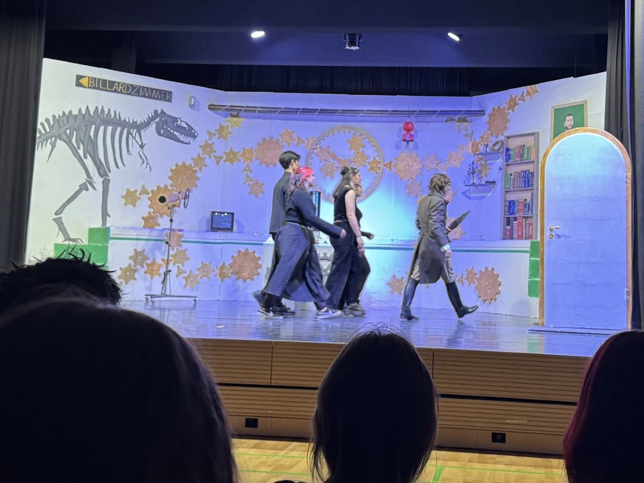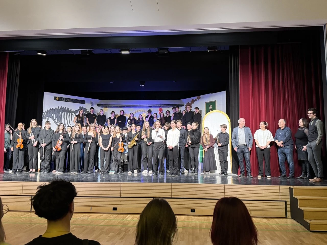 Der erste Quantensprung katapultierte die Zeitreisenden Clara (Rosa Straub), Jenna (Medea Wäldele), Max (Janik Wang), Anni (Charlotte Schmid) und Toni (Sophie Jarosch) ausgerechnet vor eine Schule in Konstanz. Doch, oh Schreck, just in diesem Moment wurde ein junger Bursche mit einem Heckerhut auf dem Kopf und einem Säbel in der Hand aus dem Gymnasium geworfen. „Ihr seid auch Revolutionäre! Schließt Euch mir an!“ rief der junge Revolutionär, fuchtelte mit seinem Säbel herum und outete sich als ein revolutionärer Hitzkopf, der nach der gescheiterten Revolution von 1848 in die Schweiz fliehen musste. Im faszinierenden Spiel entlang der Zeitlinie gelang es Adrian Keller auf faszinierende Weise, die Persönlichkeit Franz Xaver Lender und die Schulgeschichte so zu präsentieren, dass historische Fakten, humorvolle Elemente und ausdrucksstarkes Spiel der Akteure sich zu einem perfekten kulturellen Jubiläumsgeschenk formten. Daran hatte das Orchester des Musikprofils 9 (Leitung Ellen Krämer) einen klangschönen Anteil, denn die Zeitetappen wurden variantenreich mit jazzigem Sound, festlichem „Pomp and Circumstance“ und futuristischen Star-Wars-Melodien bereichert. Für die Zeitreise schuf die Bühnenbild-AG (Leiter Eberhard Schreiber) mit vielen jungen Handwerkern originelle Kulissen und großformatige Bilder. Dazu wurden die Reisenden von der Kostümbild-AG (Leiterin Tanja Esser) mit dem passenden modischen Schick der jeweiligen Zeit ausgestattet, während die Veranstaltungstechnik-AG (Leiter Bernhard Starck, Christian Vierling und Christian Wiedermann) für tolle Licht- und Ton-Effekte sorgte.