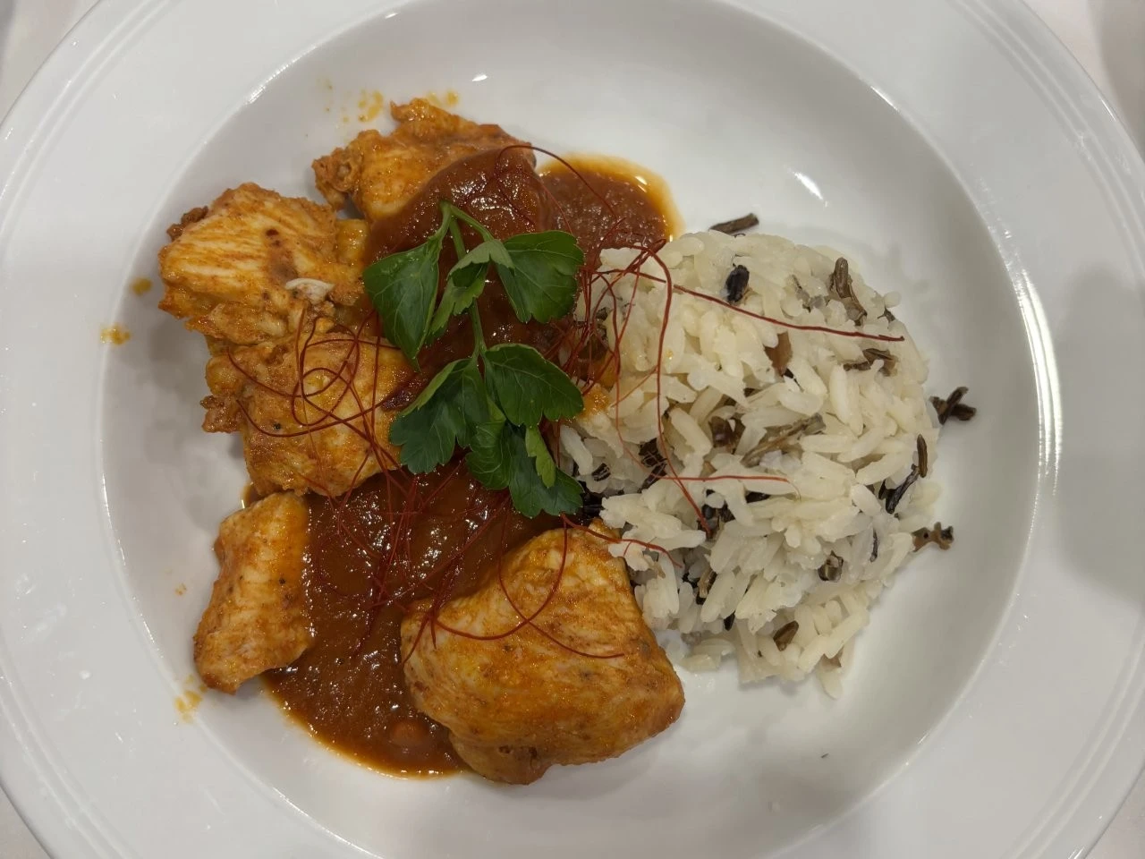 Zartes Hühnchen in einer Schoko-Chili-Marinade, serviert mit aromatischem Basmati-Wildreis.
