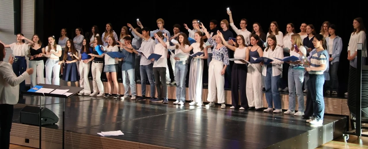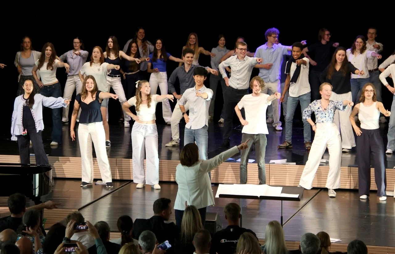 Das „Sommerfestival“ war ein weiterer Glanzpunkt zum 150. Jubiläum, doch Ellen Krämer verwies in der vollbesetzten Aula auch bereits auf das große Beethoven-Konzert am 20. Juli. Doch vor der 9. Sinfonie des Meisters waren die ewig jungen Hits der Popgruppe „ABBA“ angesagt, die Ellen Krämer mit dem Mittel- und Oberstufenchores präsentierte. Mit „Money Money Money“ und „Mamma Mia“ wurde die glitzernde Disco-Welt der 1970 lebendig, die immer noch so faszinierend ist, dass sich Jugendliche der 2025er Jahre dafür begeistern. Es machte richtig viel Spaß, den großen Chor der jungen Stimmen zu erleben, die mit einem homogenen, schönen und mitreißenden Klangbild begeisterten. Als dann bei „Dancing Queen“ die Besucher zur Choreografie des Chores im Disco-Style fröhlich mittanzten, war der berühmte Funkte endgültig übergesprungen und alle sangen: „Thank you for the music.“