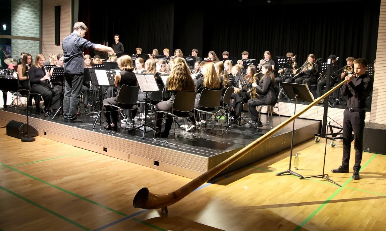 Als der Solist Benedikt Stolz beim Sommerkonzert des Lender-Gymnasiums seine Position neben dem Sinfonischen Blasorchester einnahm, den Notenständer richtete und auf seinen Einsatz wartete, waren die vielen Besucher in der Aula ziemlich überrascht. Denn das Instrument des talentierten Musikers war ein Alphorn, mit dem er nicht nur ein virtuoses Solo mit dem Stück „Alphorn Peace Song“ präsentierte, sondern unter der Leitung von Markus Bieringer mit diesem melodisch schönen „Friedenslied“ auch für eine Premiere sorgte. Denn das gab es in der langen Konzert-Geschichte des „Musik-Gymnasiums Lender“ noch nicht, dass ein Schüler ein Alphorn-Solo spielt und mit dem sinfonischen Blasorchester ein als „schwer“ eingestuften Werk darbietet. Dies war ein erlesener Beitrag zum 150. Schuljubiläum, das bis jetzt sehr variationsreich zum Klingen kam.