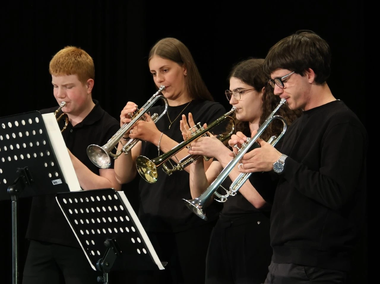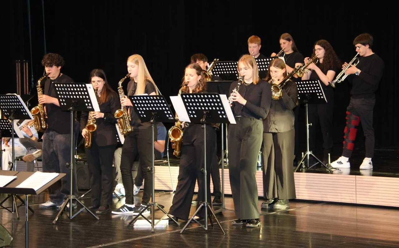 Dass die Lender-Musik breit aufgestellt ist, wurde am super Auftritt der Combo und der Bigband mit ihrem „Frontmann“  Stefan Nowak deutlich. Denn aus der Aula wurde ein „Jazzkeller“ und der fetzige Sound ließe keinen der Besucher ruhig sitzen, als die Combo mit dem Standard „Watermelon Man“ von Herbie Hancock die Session eröffnete. Die Spielfreude der Musiker war geradezu virtuos, sie riss mit und sorgte mit der Bigband für ein weiteres Highlight des Konzertes. Denn Bigband-Sound an der Lender war schon immer etwas Besonderes und  dafür kann Stefan Nowak immer wieder Schüler begeistern, um in die Welt des Jazz einzutauchen und Stücke wie „Take The A-Train“, „Take Five“, „Caravan“ und „Birdland“ richtig groovige Musik zu spielen,