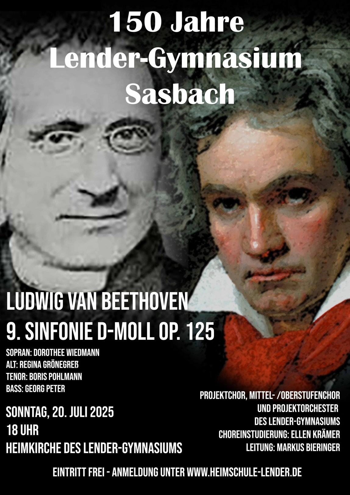 „Alle Menschen werden Brüder, wo dein sanfter Flügel weilt!“ Was war das für eine Sternstunde im 150. Jubiläumsjahr des Lender-Gymnasiums, als die „Ode an die Freude“ erklang, die  Fachschaft Musik  Beethovens 9. Sinfonie aufführte und die Besucher in der voll besetzten Heimkirche ein imposantes musikalisches Feuerwerk erleben durften. Denn mit der 9. Sinfonie hat Ludwig van Beethoven wahrlich Musikgeschichte geschrieben, nun markierte dieses Werk mit dem mitreißenden, imposanten Finale mit Chor, Solisten und Orchester den kulturellen Höhepunkt im 150. Jubiläumjahr der Lender, das mit einer vorzüglichen Aufführung unter der Leitung von Markus Bieringer seinem guten Ruf als „Musik-Gymnasium“ alle Ehre und sich selbst das schönste Jubiläumsgeschenk machte. Dies ganz im Sinne des 4. Satzes: „Freude, schöner Götterfunken, Tochter aus Elysium, wir betreten feuertrunken, Himmlische, dein Heiligtum.“