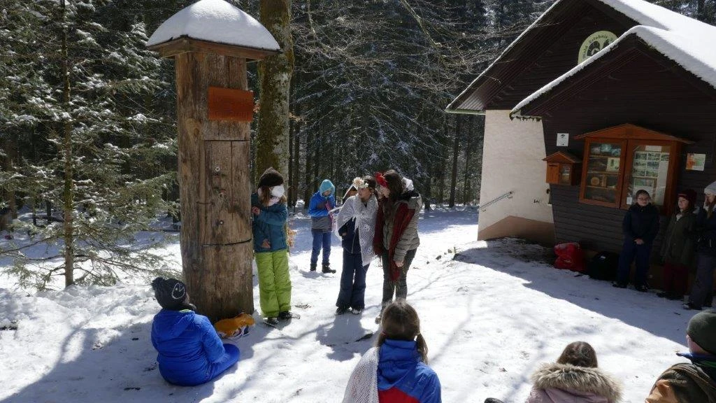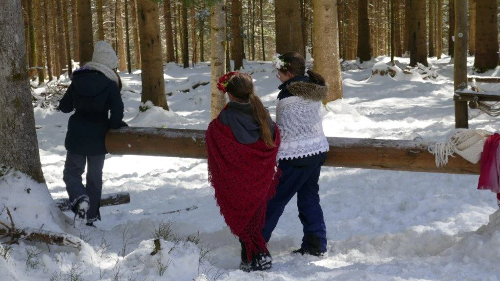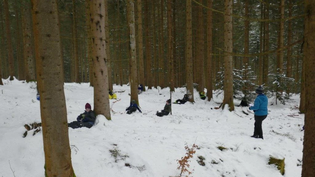 Früh am Morgen, genau genommen um 8:30 Uhr, startete der Bus der Klasse 5d in Begleitung von Frau Kreuz und Frau Großmann ab der Lender-Bushaltestelle Richtung Waldklassenzimmer, dieses befindet sich an Hundseck. Nach knapp einer halben Stunde im Bus und einem kleinen Fußmarsch erreichten wir das Waldklassenzimmer, wo auf uns auch schon Frau Schreier und Frau Wienk-Borgert warteten. Nachdem alle ihre Taschen in einer kleinen Hütte verräumt hatten, ging es auch schon los mit einer Vorstellungsrunde, bei der wir uns in einen Kreis stellten und jeder seinen Namen laut und deutlich dem Rest der Gruppe mitteilte.