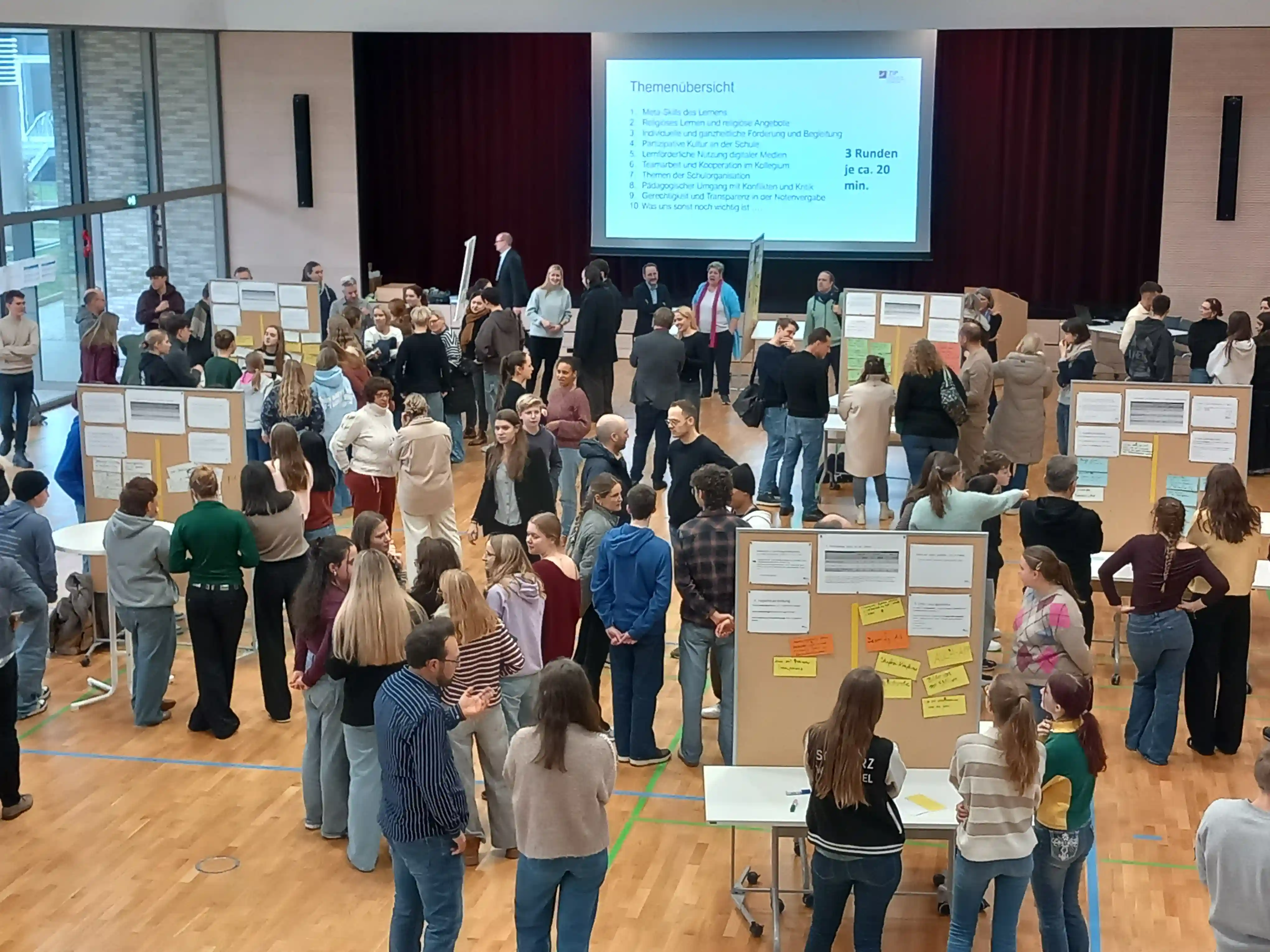 Über 1.000 Schüler, Lehrer und Eltern haben im vergangenen November an der Evaluation durch das Zentrum für Ignatianische Pädagogik teilgenommen und die Online-Fragebögen beantwortet. Im Januar wurden uns jetzt die Ergebnisse präsentiert. In getrennten Veranstaltungen wurden Schüler, Lehrer und Eltern über die Ergebnisse informiert. Soviel sei schon einmal gesagt: Die Lender hat wirklich gut abgeschlossen. Die Zufriedenheitswerte waren überdurchschnittlich hoch. Dennoch gibt es natürlich auch Bereiche, die noch verbesserungswürdig sind. In einer gemeinsamen Dialogveranstaltung wurde über genau diese beraten, um Schlussfolgerungen für die weitere Schulentwicklung zu ziehen. Lebhaft wurde an den zehn Ständen diskutiert. Themen waren unter anderem gerechte Noten, Schulorganisation, Meta-Skills des Lernens oder auch digitales Lernen.