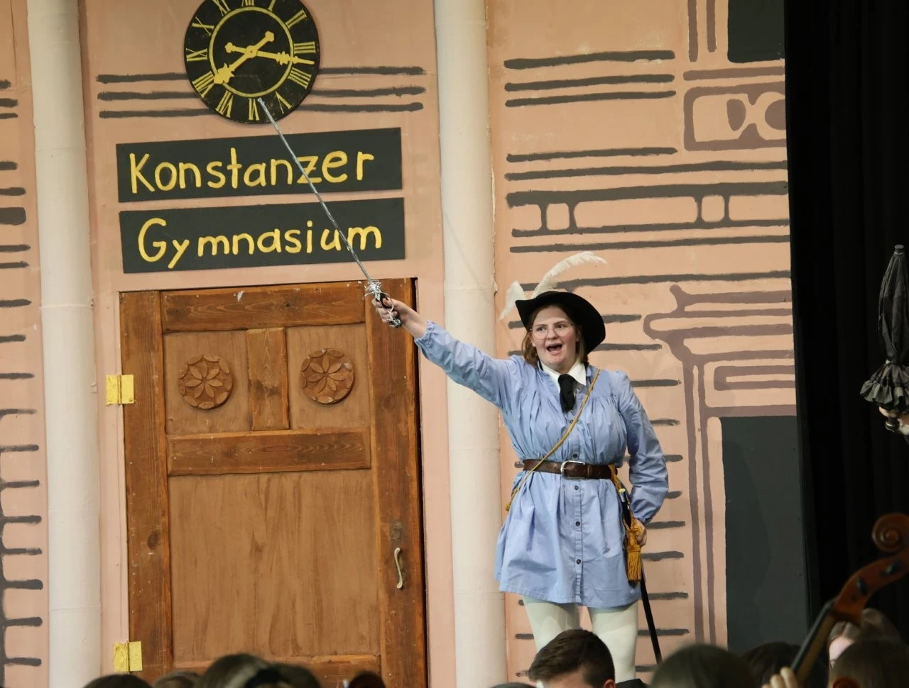Wie erklären wir Herrn Lender denn nur den Lender-Geist?“ Für die Schüler Ruby, Mia und Liam war es wahrlich nicht einfach, als beim Festakt 150 Jahre Heimschule Lender plötzlich ein Herr mit Zylinder und Frack hereinplatzte, ziemlich verdutzt „seine Schule“ suchte und beim Besuch in der Cafeteria mit „eine Portion Gemischt mit Soße“, „vegetarischen Nuggets“ und „Mousse au Chocolat“ überhaupt nichts anfangen konnte. Doch die Schüler in der Spielszene waren mit dem Zeitreisenden sehr verständnisvoll, demonstrierten ihm die Funktion von Tablets und erklärten ihm, dass es keine schulische Metzgerei mehr gebe und Schüler auch nicht mehr vor dem Unterricht auf dem Acker Lebensmittel anbauen mussten. Aber trotz der Unterschiede von früher und heute blieb der „Lender-Geist“ gleich. Denn der stehe für „Gemeinschaft, Toleranz und Nächstenliebe“ und dafür, dass es zwar tausende Gymnasien, aber nur eine Lender gebe, so das Fazit der Begegnung mit „Herrn Lender“. Nach dem Skript „Eat. Pray. Lender“ der Kreativ-Schreiben-AG (Leitung Laura Fischer) wurde auf lebendige und humorvolle Weise der ganz besonderen „Lender-Geist“ auf den Punkt gebracht.