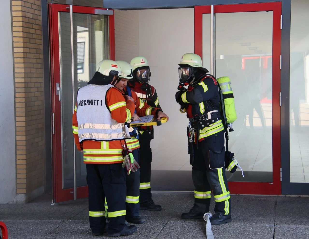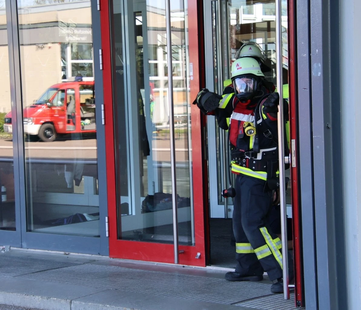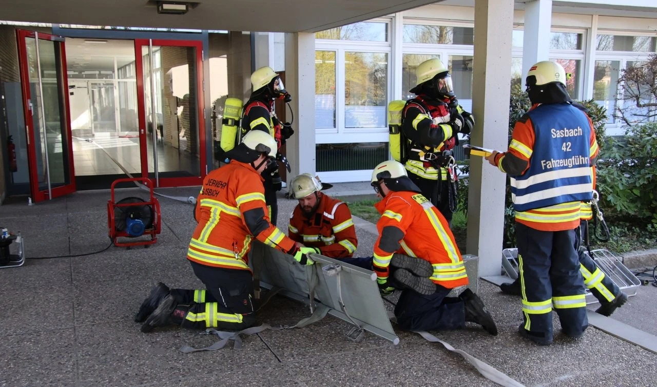 Wenn das Schulgebäude des Lender-Gymnasiums von Kommandant Swen Broß in Sachen Brandschutz die Note „sehr gut“ erhält, dann muss diese Bewertung aus der Sicht eines Fachmanns ganz besondere Gründe haben. Diese haben sich bei einer groß angelegten Übung der Sasbacher Feuerwehr in Kooperation mit den Wehren aus Lauf und Sasbachwalden sowie der DRK-Bereitschaft Sasbach sehr gut bewährt, nachdem die Schulstiftung der Erzdiözese Freiburg fortlaufend sehr viel Geld in das Lender-Gymnasium investierte, um in allen Gebäude auf dem weitläufigen Campus einen sehr guten vorbeugenden Brandschutz bereitzustellen. Davon konnten sich die Feuerwehrleute bei ihrer Übung überzeugen, als um 16 Uhr Rauch im östlichen Teil des Schulgebäude sichtbar wurde, der Brandmelder Alarm auslöste und zur Evakuierung der Schule aufforderte. Wenig später rückten die Fahrzeuge der Sasbacher Wehr und die angeforderten Einsatzkräfte der Nachbarwehren an, die rings um das Schulgebäude in Stellung gingen. Derweil hatte der Kommandant einen Sicherheitskasten geöffnet, sah dort die Platzierung des Melders und entnahm sich dann die entsprechende Laufkarte mit Wege- und Raumplänen.