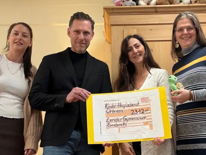 Am Dienstag, 25. Nov, waren Schulleiter Marco Cataldo und Elternbeiratsvorsitzende Claudia Vygen in Offenburg verabredet. Sie übergaben dort die große Spende an den Kinder- und Familienhospizdienst Ortenau e.V., die aus der Sammlung des Schulfestes zusammenkam. Die Leiterin, Frau Helena Gareis, die sich extra Zeit genommen hatte und ihre Kollegin, Frau Melanie Braun, die für die Büroorganisation Verantwortung trägt, waren begeistert über das Engagement unserer „Lender“ und beide freuten sich über die beträchtliche Summe und über die Möglichkeit, kundzutun, dass der Verein allen zum Gespräch und zur Unterstützung zur Seite steht, die in der Familie einen nahen Verwandten (Elternteil oder Kind) verloren haben. Sie zeigten uns ihre freundlichen und warmen Räume, die für Gespräche und bald auch für Weihnachtsfeiern genützt werden können. Hier sprachen sich die beiden ganz klar dafür aus, dass man sich jederzeit in Notsituationen dort melden darf.