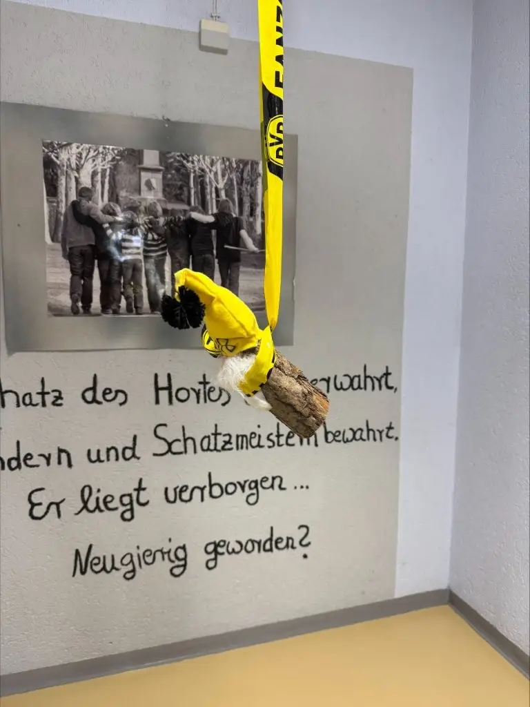Die Antwort ließ nicht lange auf sich warten … Der BVB-Weihnachtswichtel wurde im Tagesheimflur mit dem BVB-Absperrband gut sichtbar befestigt.
