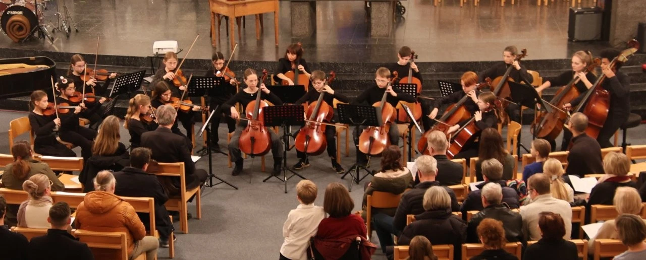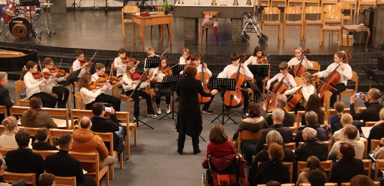 Im Stile der venezianische Mehrchörigkeit des 16. Jahrhunderts eröffnete ein Blechbläserensemble (Leitung Jürgen Bruder) das Konzert von der Empore aus, wobei mit der achtstimmigen „Canzon Septimi Toni No 2“ von Giovanni Gabriele das kunstvolle Wechselsiel wunderbar zum Klingen kam. Die Streicherklasse 6 (Leitung Marylène Lung und Stephan Lung) erfreute mit einer schönen Filmmusik aus „Les Choristes“ und ließ mit „Hört der Enge helle Lieder“ Weihnachtsstimmung aufkommen, während das Streichervororchester (Leitung Katharina Fehler) mit dem Musical „Beauty and the Beast“ und dem Ballett-Walzer „Dornröschen“ von Tschaikowsky viel Freude bereitete.