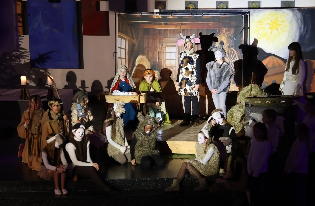 Der Weihnachtsstern leuchtete am Lender-Gymnasium schon ziemlich hell, als von der Empore der Heimkirche der „Andachtsjodler“ erklang, Hirten sich auf den Weg nach Bethlehem machten und Ochs und Esel eifrig beschäftigt waren, den Stall blitzblank zu putzen und für viel Wärme zu sorgen. Denn, so war bei dem herrlichen Singspiel „Ochs und Esel wissen mehr“, vor 400 Besuchern zu hören: „Würden alle öfter kuscheln, statt zu tratschen und zu tuscheln, wär die Welt ein wenig wärmer und an Hass und Neid viel ärmer.“ Diese Botschaft passte bestens zu den Gedanken von Schulseelsorger Gabriel Breite über „Liebe! Ein Aufruf“ des Bestseller-Autors Daniel Schreiber, dass es gegen den Verfall des Miteinander eine „Haltung der radikalen Liebe“ bedarf. „Nur Liebe kann die Welt retten.“
